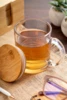 Kubek ze szkła pochodzącego z recyklingu z bambusową pokrywką, 300 ml. W pudełku z papieru kraft.
