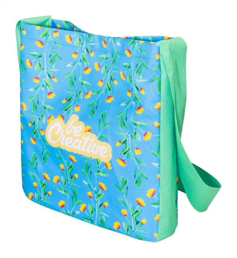 Torba na ramię wykonana na zamówienie z poliestru 600D RPET, z długim paskiem na ramię i zapięciem na guziki. Z nadrukowaną grafiką sublimacyjną na całej powierzchni i charakterystyczną metką RPET. Min. Ilość: 25 szt.
