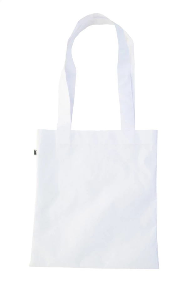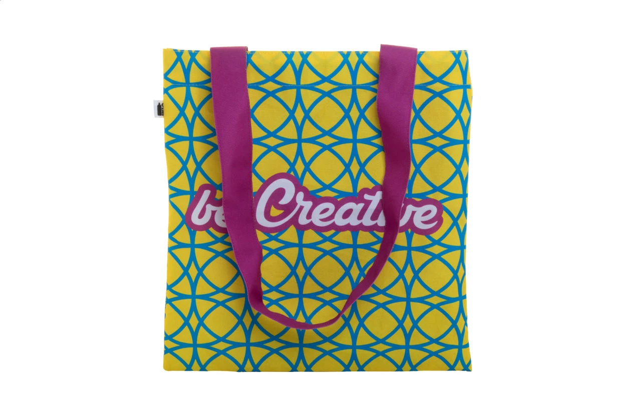 Wykonana na zamówienie torba na zakupy z poliestru 600D RPET, z długimi uchwytami. Z nadrukowaną grafiką sublimacyjną i charakterystyczną metką RPET. Min. ilość: 25 szt.