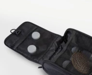 Wisząca kosmetyczka z tworzywa RPET z przegródkami zapinanymi na suwak i kieszeniami z siatki. Poliester 600D RPET, z charakterystyczną metką RPET.