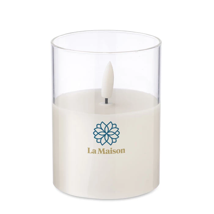 Świeca woskowa LED z efektem prawdziwego płomienia w szklanym pojemniku. Nie zawiera 2 baterii AA.