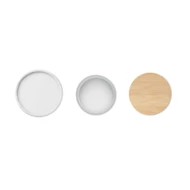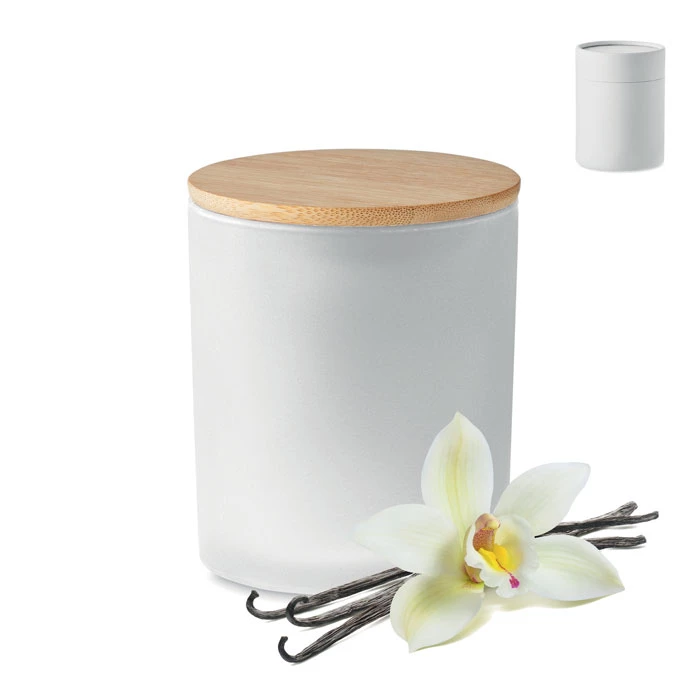 Wosk roślinny, świeca roślinna o zapachu cynamonu, wanilii, drzewa sandałowego lub jaśminu, w szklanym, matowym słoiku z bambusową pokrywką. 200 gr. Czas palenia: 33 godziny. Zapakowana w papierowe pudełko upominkowe w kształcie tuby. Bambus jest produktem naturalnym, dlatego mogą wystąpić nieznaczne różnice w kolorze, wzorze i rozmiarze.