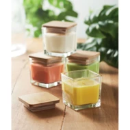 Zapachowa świeca woskowa na bazie roślin w kwadratowym szklanym pojemniku z bambusową pokrywką. 50 gr. Czas palenia: 8 godzin. Biały (06) zapach waniliowy, żółty (08) zapach cytrynowy, pomarańczowy (10) zapach pomarańczowy, zielony (48) zapach jabłkowy.