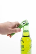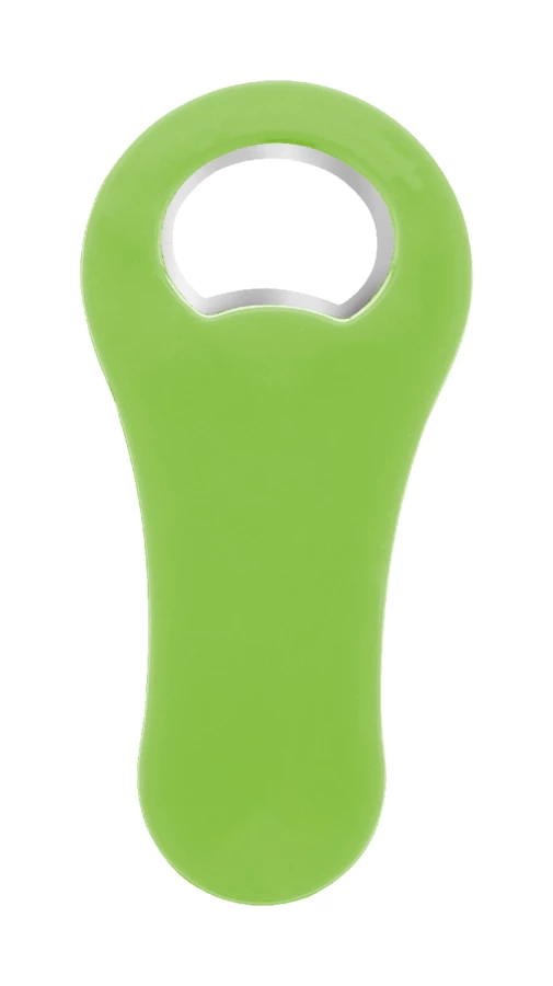 Otwieracz do butelek wykonany z recyklingowanego plastiku ABS z magnesem na lodówkę.
