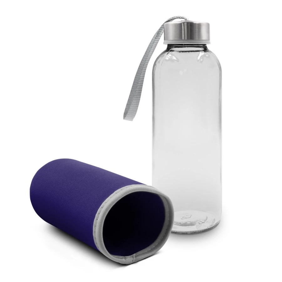 Butelka 420 ml, posiada zakrętkę w srebrnym kolorze oraz uchwyt ułatwiający noszenie, kolorowy pokrowiec w komplecie, produkt wykonany ze szkła i stali nierdzewnej