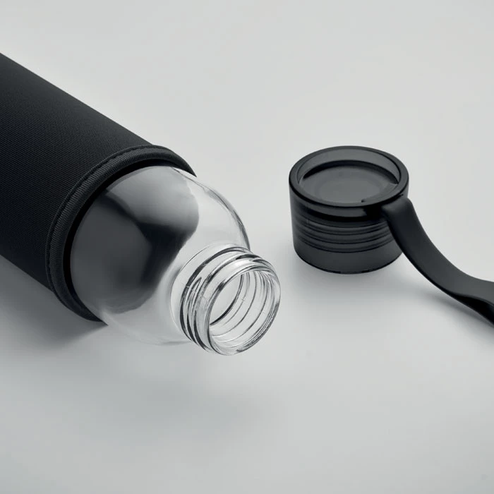 Szklana butelka z recyklingu z neoprenowym etui, z zakrętką z PP i z silikonową zwieszką. Szczelna. Pojemność: 500 ml.