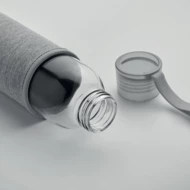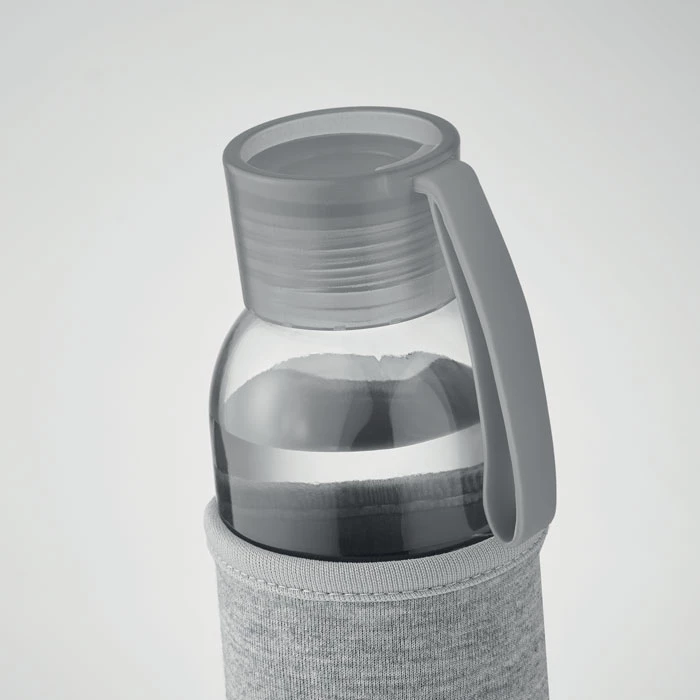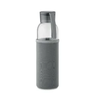 Szklana butelka z recyklingu z neoprenowym etui, z zakrętką z PP i z silikonową zwieszką. Szczelna. Pojemność: 500 ml.