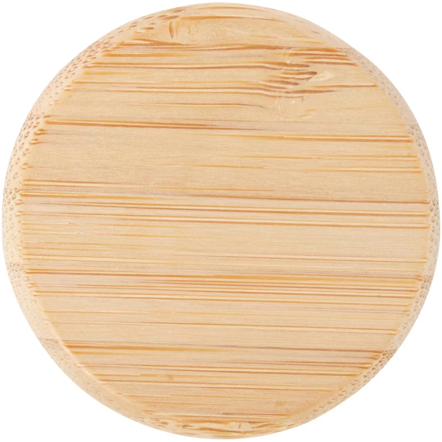 Butelka na wodę ze szkła o pojedynczych ściankach, wyposażona w zakrętkę wykonaną z bambusa, pochodzącą z bardziej zrównoważonych i społecznie odpowiedzialnych źródeł. W zestawie znajduje się wygodny silikonowy pasek ułatwiający noszenie. Zapakowane w pudełko upominkowe wykonane z kartonu z recyklingu. Pojemność: 500 ml.