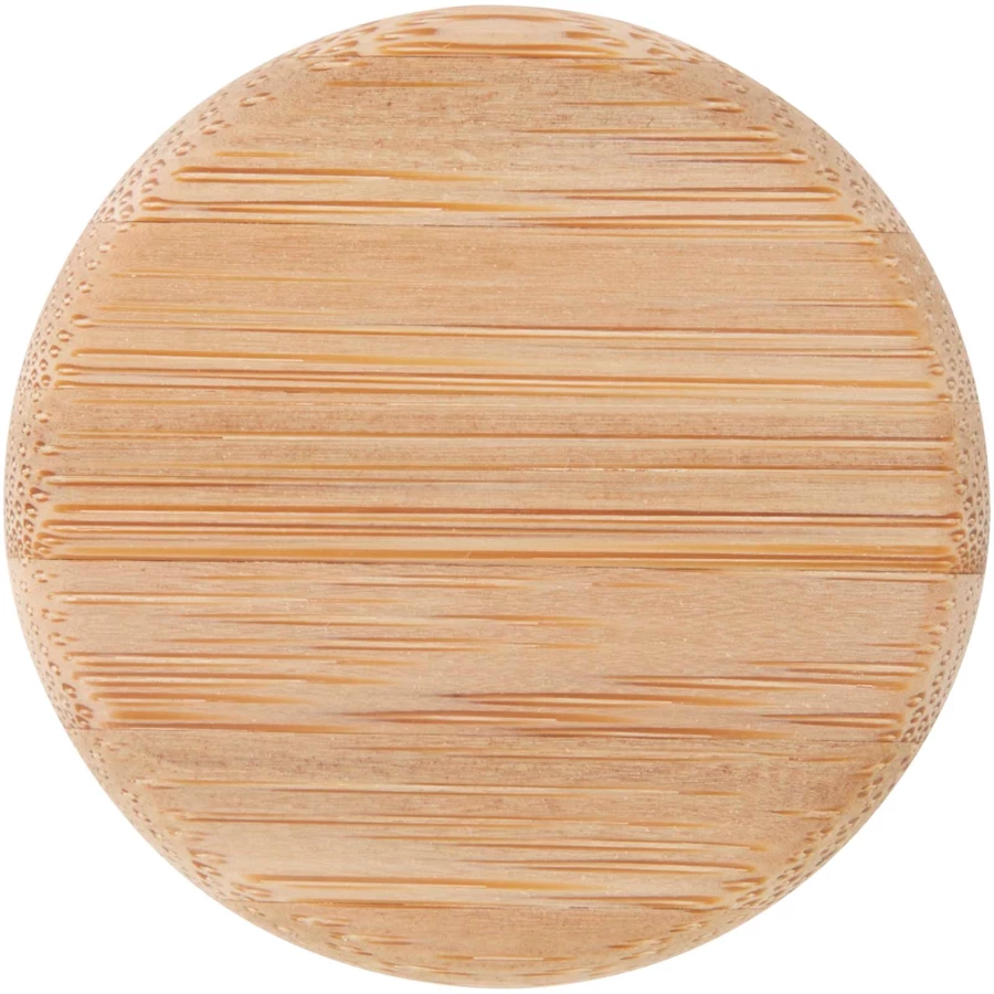 Butelka na wodę ze szkła o pojedynczych ściankach, wyposażona w zakrętkę wykonaną z bambusa, pochodzącą z bardziej zrównoważonych i społecznie odpowiedzialnych źródeł. W zestawie znajduje się wygodny silikonowy pasek ułatwiający noszenie. Zapakowane w pudełko upominkowe wykonane z kartonu z recyklingu. Pojemność: 500 ml.