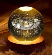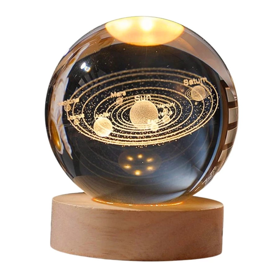 Ta magiczna szklana kula to niepowtarzalny element dekoracyjny i edukacyjny! Dzięki technologii laserowego grawerowania wewnątrz szkła, lampka tworzy hipnotyzującą iluzję 3D przedstawiającą Układ Słoneczny. Umieszczona na drewnianej podstawce i podświetlona diodami LED, kula nadaje każdemu pomieszczeniu niesamowitego klimatu.