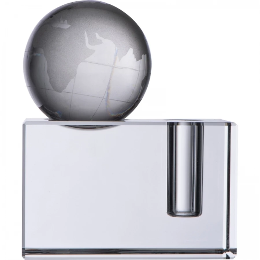 Szklany blok z globusem i z miejscem na długopis. Metodą graweru laserowego można umieścić na nim tekst gratulacji lub życzenia. Zapakowany w ozdobne pudełko wyściełane satyną.