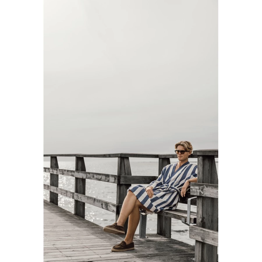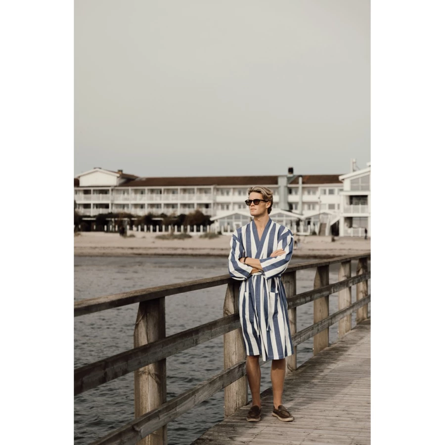 Szlafrok, wykonany z mieszanki 69% bawełny z recyklingu oraz 29% poliestru z recyklingu, miękki i przewiewny, posiada pasek w talii i kieszenie