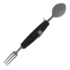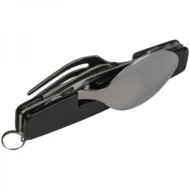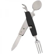Sztućce kempingowe wykonane ze stali nierdzewnej, cztery rozkładane elementy: łyżka, widelec, nożyk i otwieracz do butelek.
