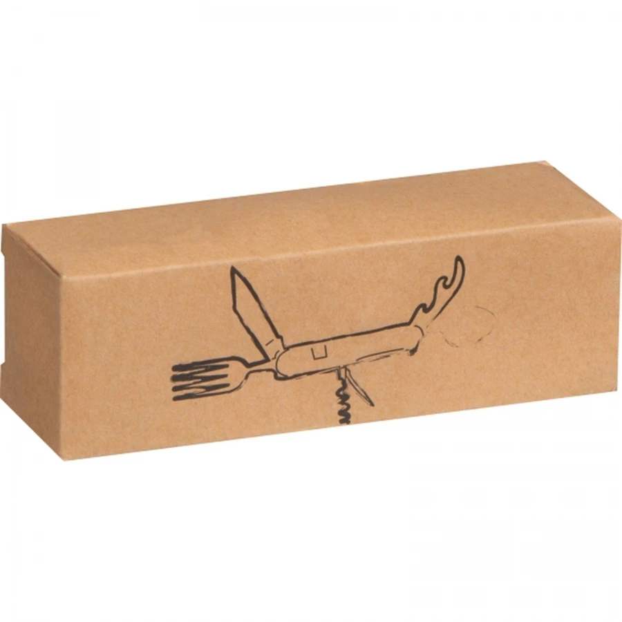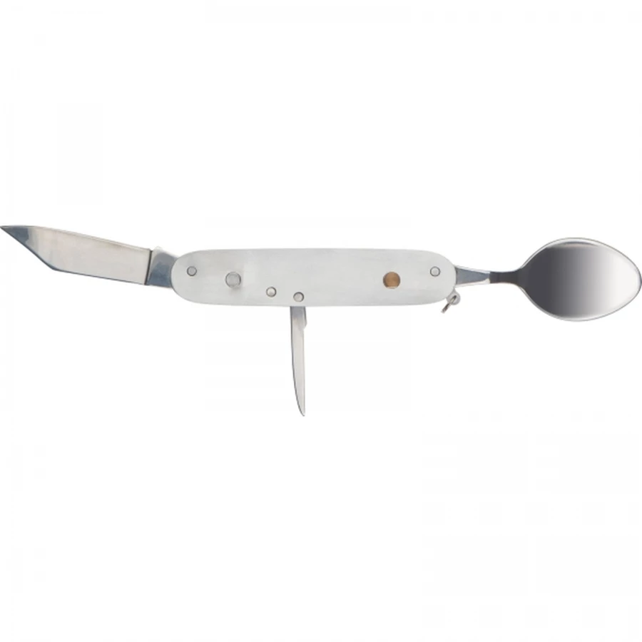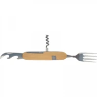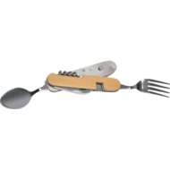 Sztućce kempingowe, wykonane ze stali nierdzewnej w obudowie z drewna bambusowego. Narzędzie wyposażone w łyżkę, nóż, otwieracz do butelek, nożyk do folii, korkociąg oraz widelec.
