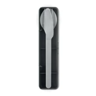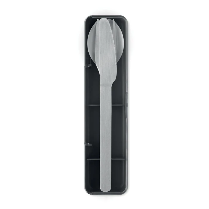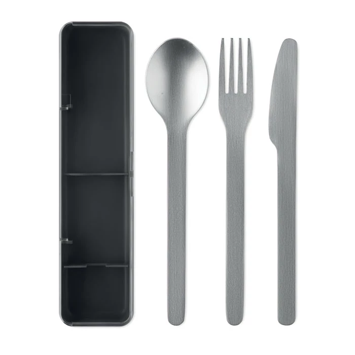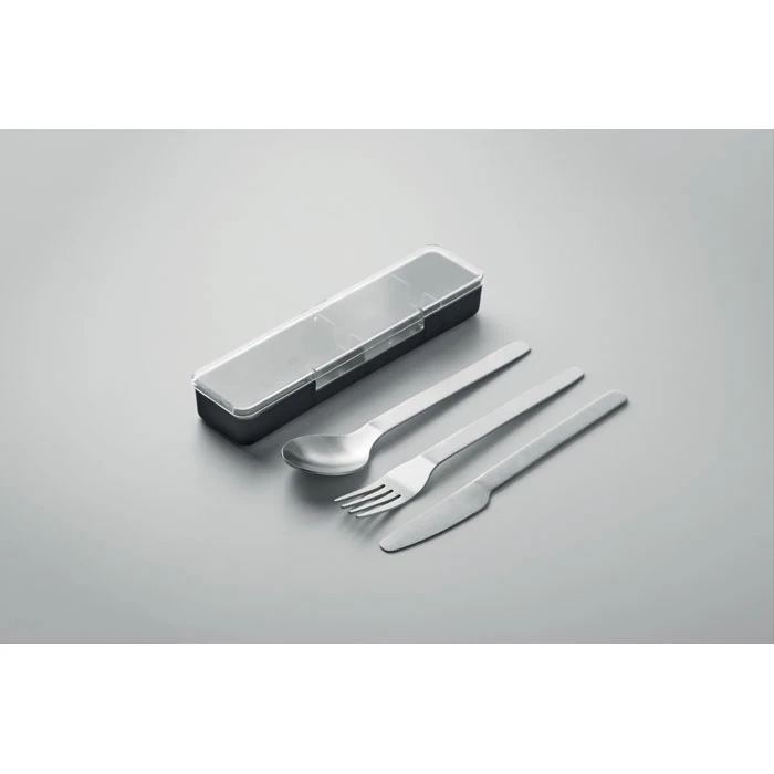 Zestaw sztućców ze stali nierdzewnej z etui z PP. Zestaw zawiera widelec, nóż i łyżkę.
