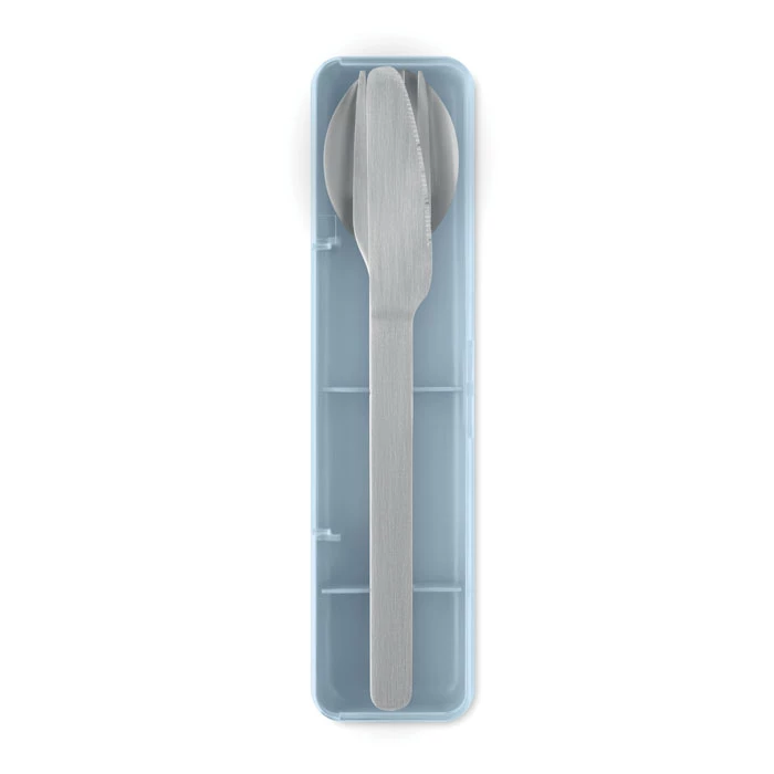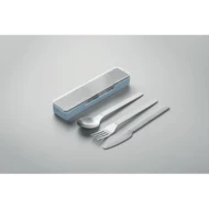 Zestaw sztućców ze stali nierdzewnej z etui z PP. Zestaw zawiera widelec, nóż i łyżkę.