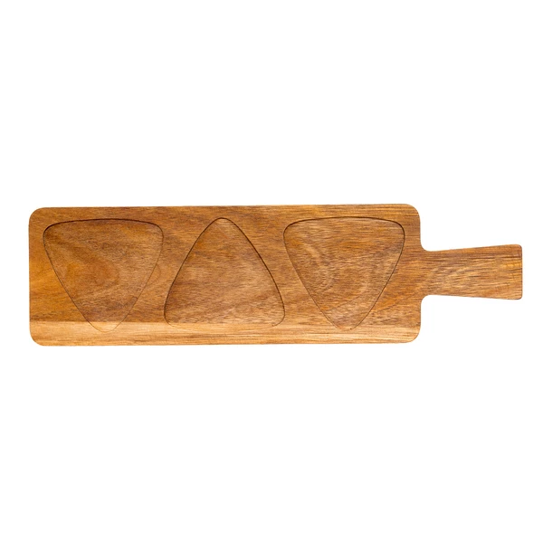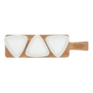 Zestaw do serwowania składający się z tacy z drewna akacjowego i 3 ceramicznych miseczek, które służą do podawania różnych przekąsek, dodatków lub sosów.