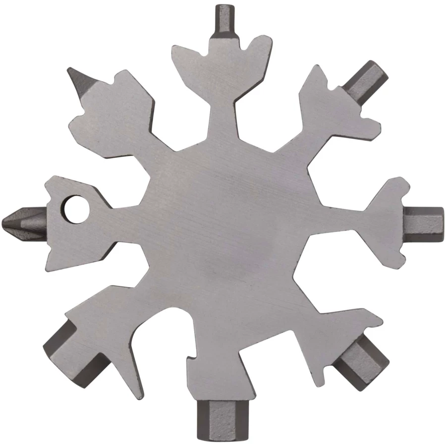 Solidne i kompaktowe 8-funkcyjne narzędzie wielofunkcyjne wykonane ze stali nierdzewnej, które można nosić przy kluczach.