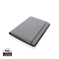 Teczka konferencyjna A4 z notatnikiem (20 kremowych kartek 64 g/m2 z papieru z recyklingu w linie), okładka wykonana ze skóry pochodzącej z recyklingu, wewnątrz 1 duża kieszeń, 3 kieszenie w rozmiarze telefonu, miejsce na 4 wizytówki, ślad węglowy produktu: 2,06 kg CO2