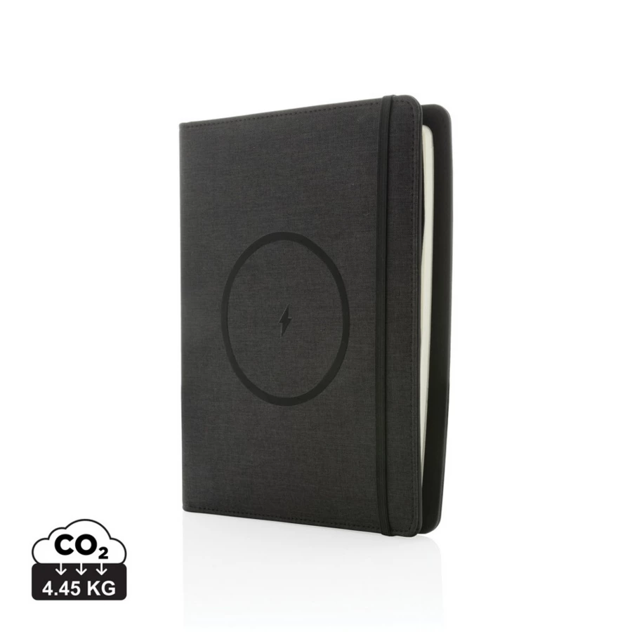 Teczka konferencyjna A5 wykonana z rPET, bezprzewodowy power bank 5000 mAh, ładowarka bezprzewodowa 5W na przedniej stronie okładki, port USB do ładowania urządzeń za pomocą kabla, bezprzewodowe ładowanie jest kompatybilne ze wszystkimi urządzeniami posiadającymi możliwość ładowania indukcyjnego, wejście 5V/2.1A, wyjście 1: 5V/2.1A, wyjście 2: 5V/2.1A, wyjście bezprzewodowe 5W, wzór zastrzeżony®, ślad węglowy produktu: 4,45 kg CO2