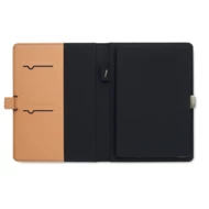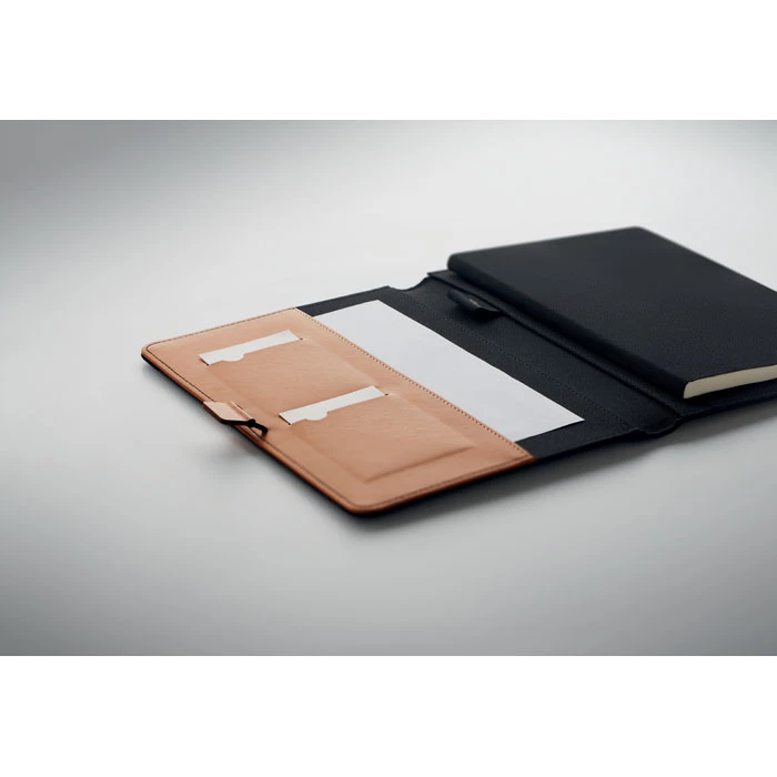 Teczka A5 z RPET z detalami ze sztucznej skóry. Notatnik A5 z twardą, korkową okładką. Oprawiony. 128 stron w linie z papieru z recyklingu (64 arkusze). Uchwyt na długopis. 2 kieszonki na karty i jedna duża przegroda. Elastyczny pasek, z metalowymi detalami. FSC®-certified | FSC MIX, P8.6, FSC-C213206
