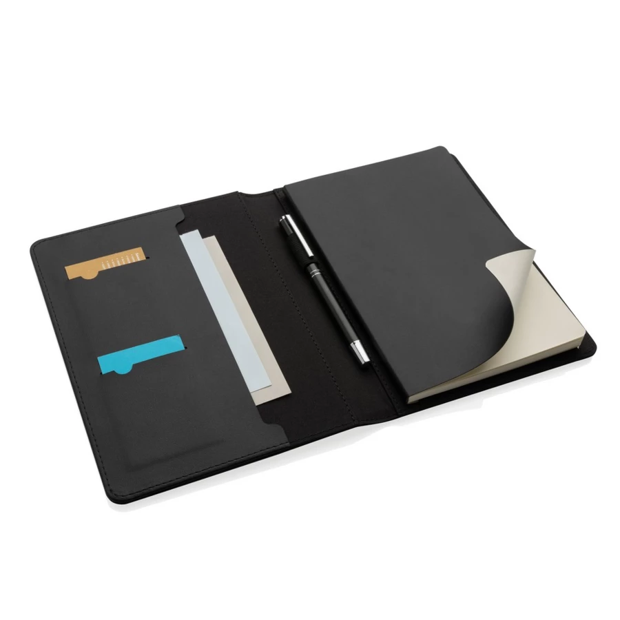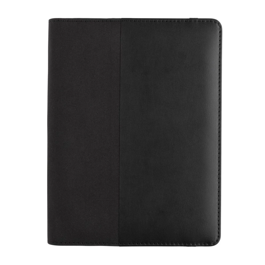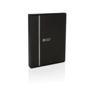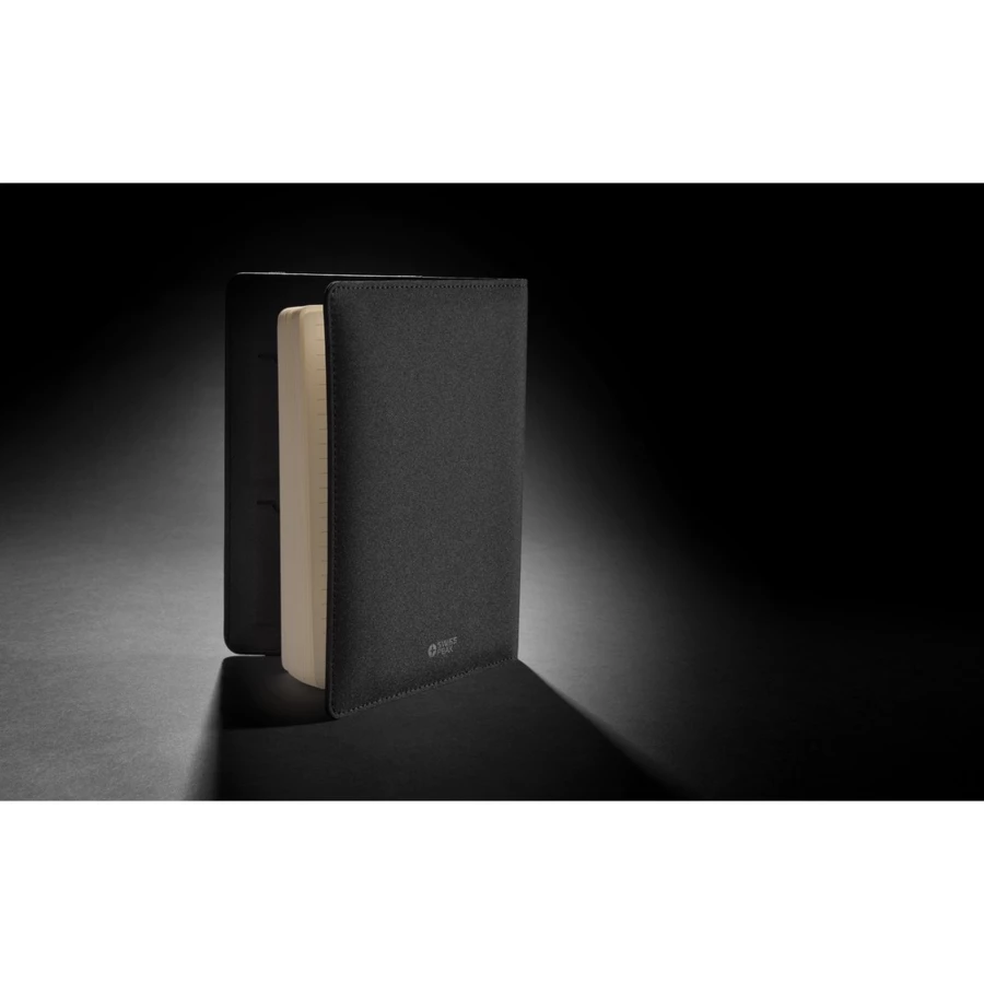 Teczka konferencyjna A5 z notatnikiem (20 kartek kremowych o gramaturze 80 g/m2 z certyfikatem FSC®), kieszenie i pętla na długopis wewnątrz, wykonana z PU i poliestru z recyklingu, posiada znacznik AWARE™, który gwarantuje, że wykorzystane materiały pochodzą z recyklingu, w pudełku z papieru z certyfikatem FSC®, ślad węglowy produktu: 0,91 kg CO2