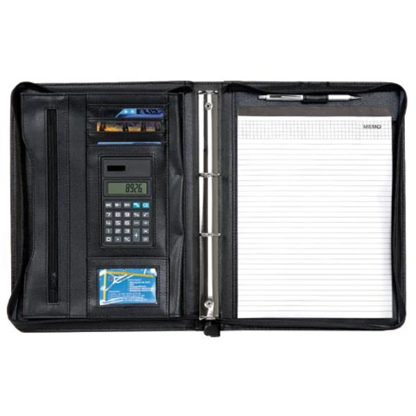 Wykonana z ekoskóry czarna teczka konferencyjna z poręcznym uchwytem. Wyposażona w kalkulator, wkład papierowy A4, metalowy ring, kieszonkę z zamkiem oraz uchwyt na długopis. Posiada także kieszonki na wizytówki oraz przegródki na dokumenty. Kalkulator zasilany 1 baterią AG10 dołączoną do produktu. Długopis nie jest dołączony.