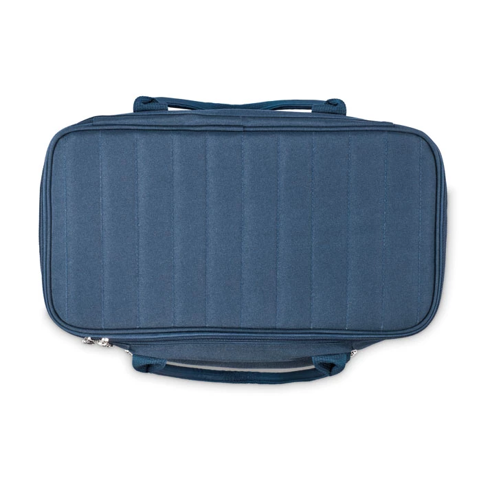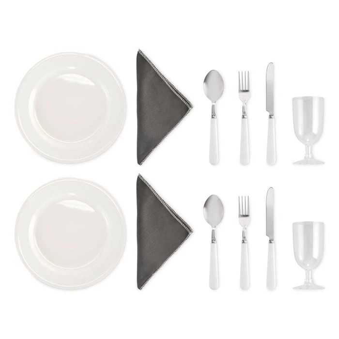 Termiczna torba piknikowa z poliestru 600D RPET dla 2 osób z zapinana na zamek. Sztućce (stal nierdzewna) w przedniej kieszeni, 2 talerze z PS, 2 szklanki z PS i 2 bawełniane serwetki. Pojemność 18l.