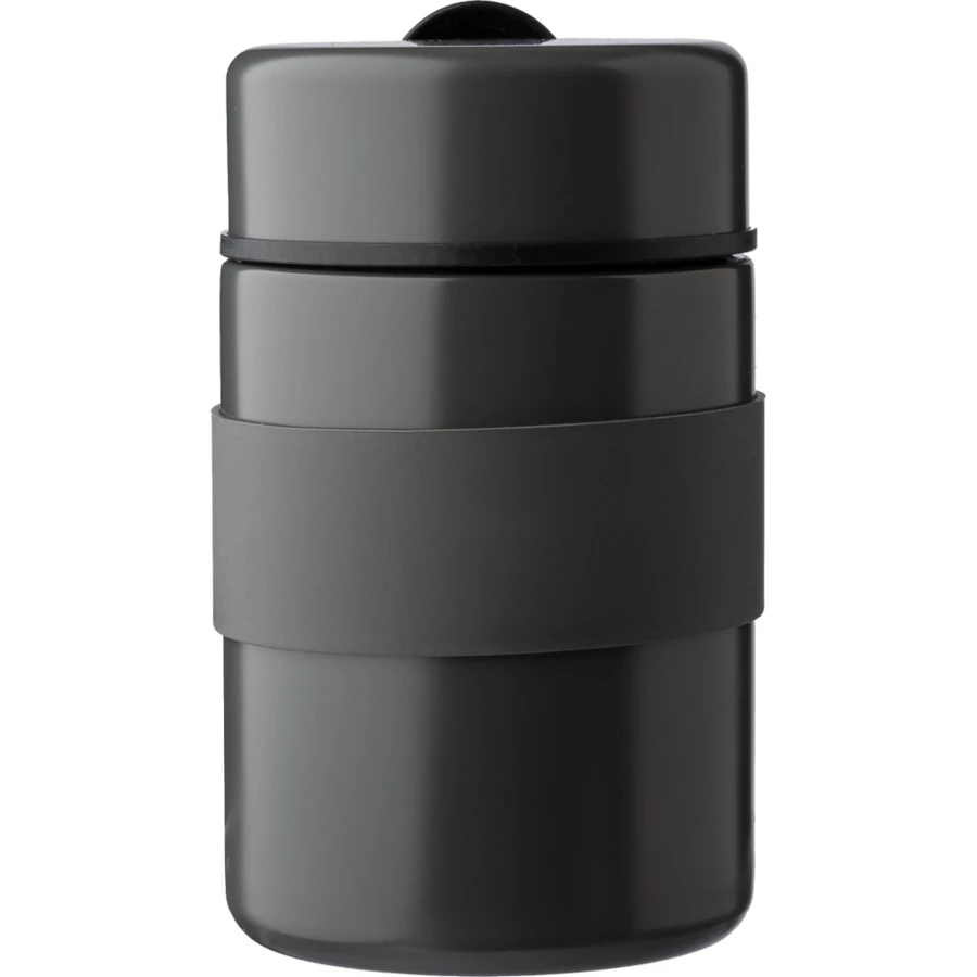 Pojemnik na żywność 460 ml z łyżeczką, silikonowy uchwyt w kolorze pojemnika, posiada podwójne ścianki ze stali nierdzewnej z próżnią między ściankami, co spowalnia oddawanie temperatury na zewnątrz, zachowując funkcje termosu, produkt wykonany ze stali nierdzewnej i plastiku, utrzymuje temperaturę napojów gorących do 20 godzin +leakproof