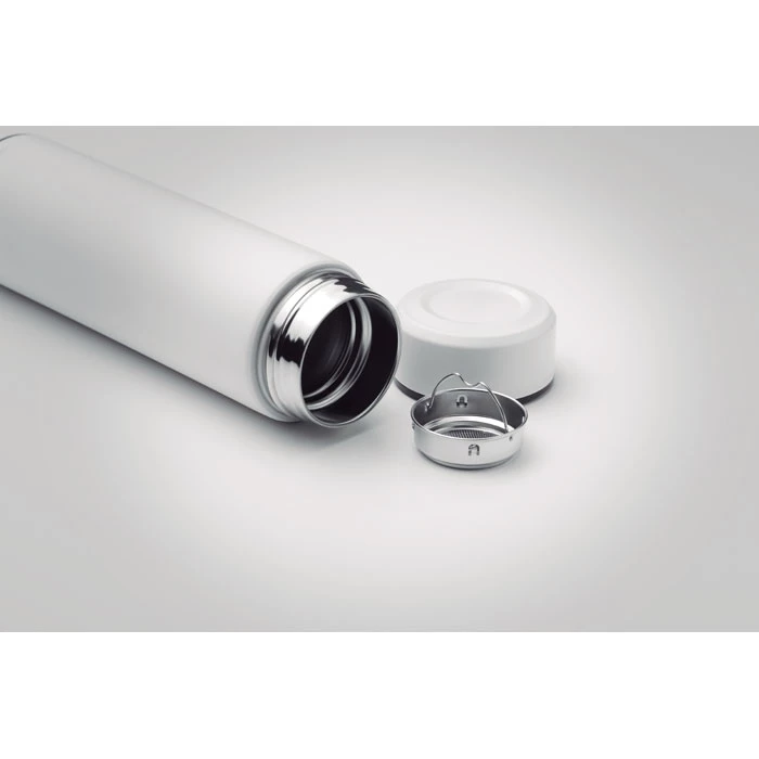 Izolowany termos ze stali nierdzewnej z podwójnymi ściankami i dodatkowym zaparzaczem do herbaty. Pojemność 425 ml. Szczelny.