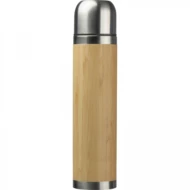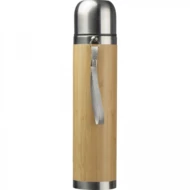 Termos z podwójnymi ściankami ze stali nierdzewnej (izolacja próżniowa) w bambusowej obudowie, z kubkiem i paskiem na rękę. Pojemność 500 ml.