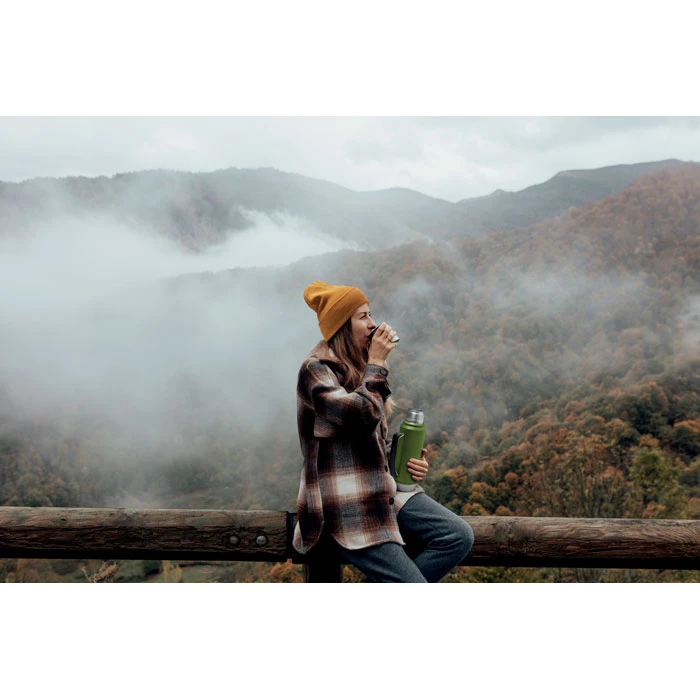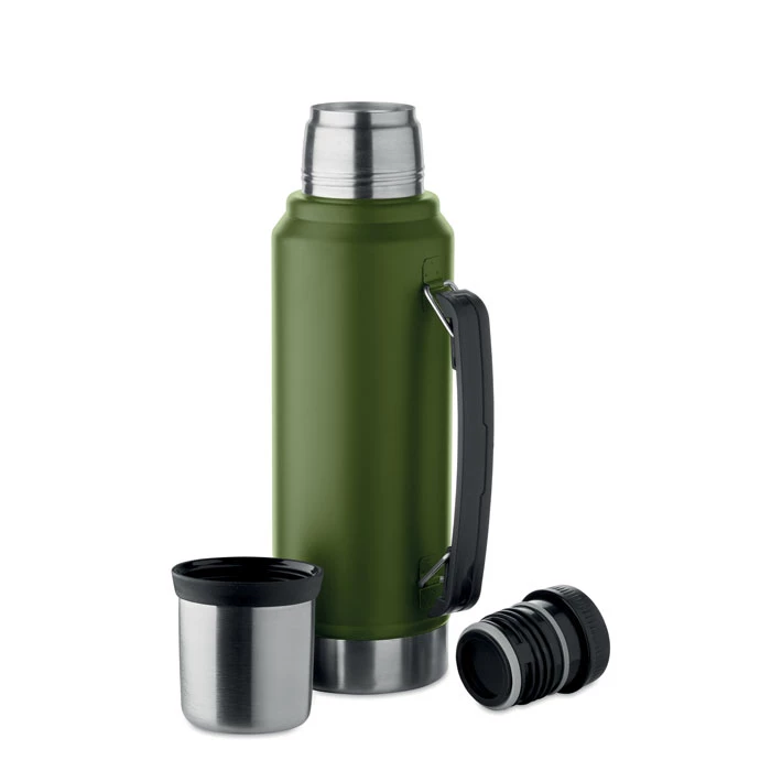 Dwuścienny termos z izolacją próżniową wykonany ze stali nierdzewnej z recyklingu (90% stali nierdzewnej pochodzącej z recyklingu i 10% stali nierdzewnej) z uchwytem z boku. Z pokrywką z PP i kubkiem z recyklingowanej stali nierdzewnej. Nie przecieka. Pojemność: 1 l.
