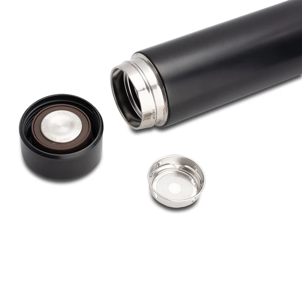 Termos próżniowy o pojemności 450 ml z dwiema metalowymi ściankami, świetnie utrzymujący ciepło, szczelny. Wykonany ze stali nierdzewnej 18/8 o podwyższonej jakości. Urzeka eleganckim połączeniem czerni i korkowej podstawy. Posiada stalowy zaparzacz do herbaty. Utrzymuje temperaturę powyżej 40°C przez 15 godzin.