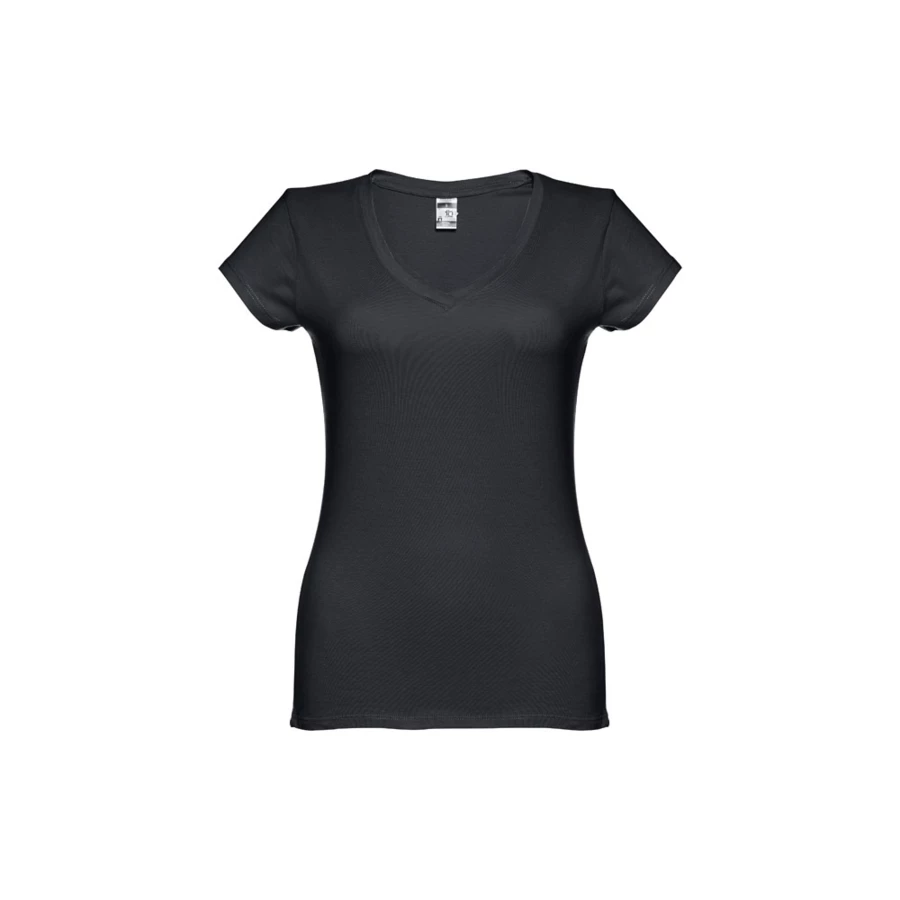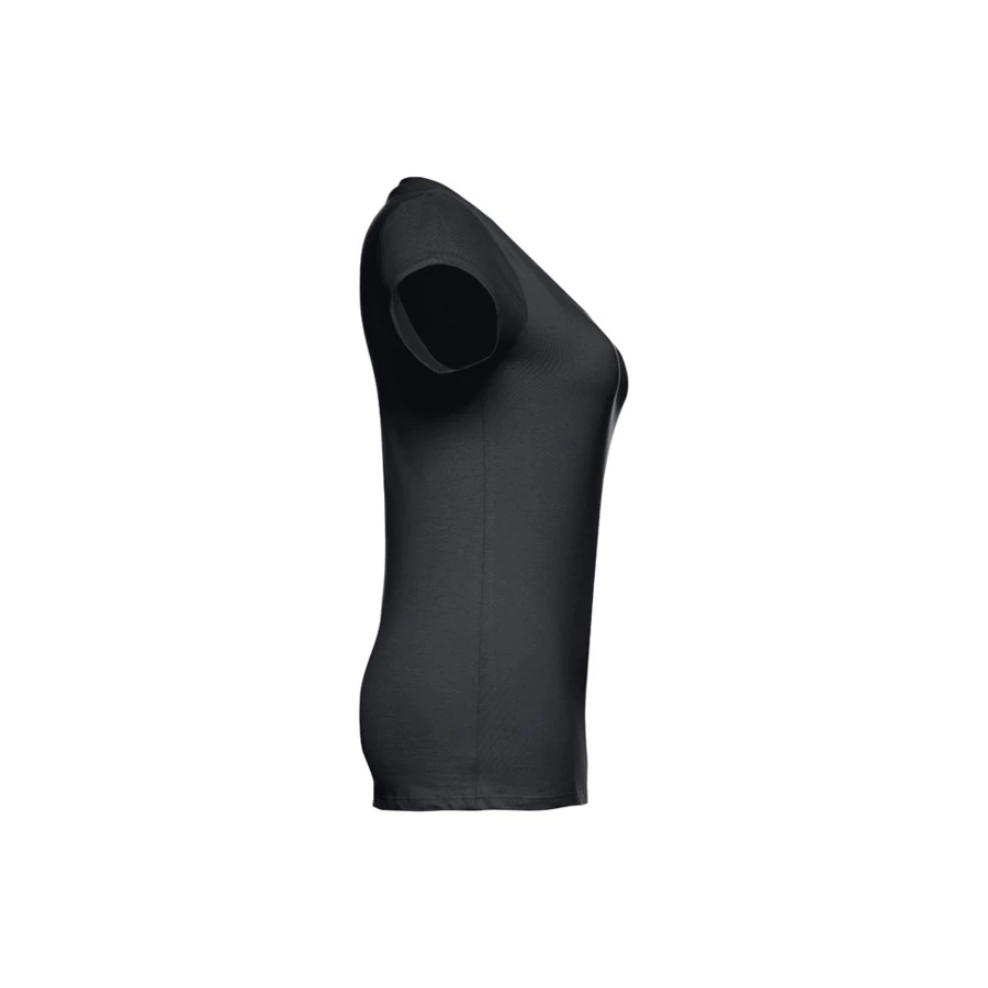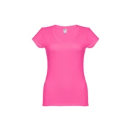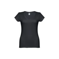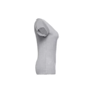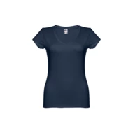 Damski t-shirt o dopasowanym kroju. 100% bawełna dżersej (150 g/m²) ze zgrzebną przędzą bawełnianą (kolory: 194, 195 i 199: 60% bawełna/40% poliester). Posiada kołnierzyk z dżerseju z dekoltem w kształcie litery „V”, wzmocniony od wewnątrz dżersejową tasiemką. Podwójne szwy na rękawach i dolnej części. Rozmiary: S, M, L, XL, XXL