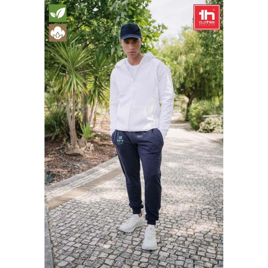 Poddane obróbce enzymatycznej spodnie dresowe (unisex) wykonane z materiału French Terry (70% bawełny pochodzącej ze zrównoważonych upraw) i 30% poliestru z recyklingu (300 g/m²). Elastyczny pas ze ściągaczami 1x1 w kolorze spodni i dwie kieszenie boczne z niewidocznymi zamkami i wzmocnionymi szwami. Dół spodni dresowych jest również wykonany ze ściągacza 1x1. Rozmiary: XS, S, M, L, XL, XXL