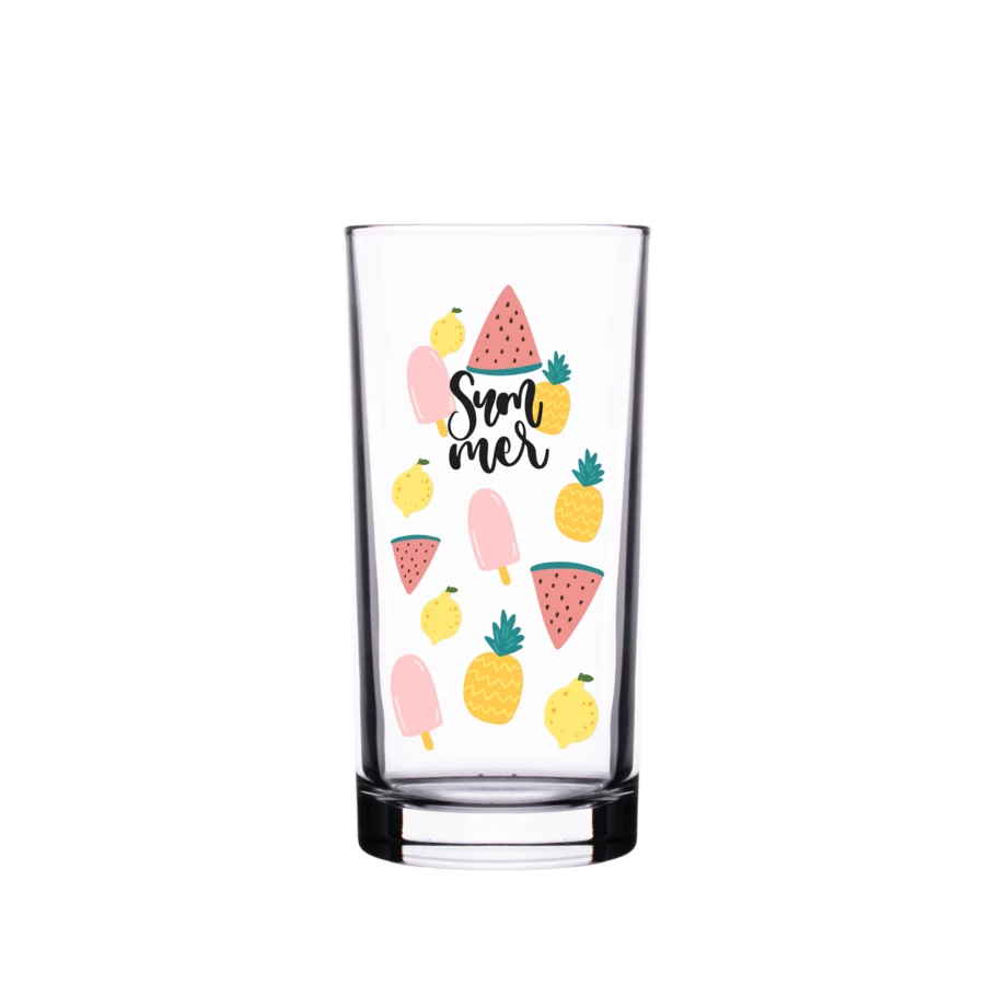 Smukła szklanka o wysokich prostych ściankach. Posiada gruby, stabilizujący spód. Wykonana ze szkła pochodzenia europejskiego.