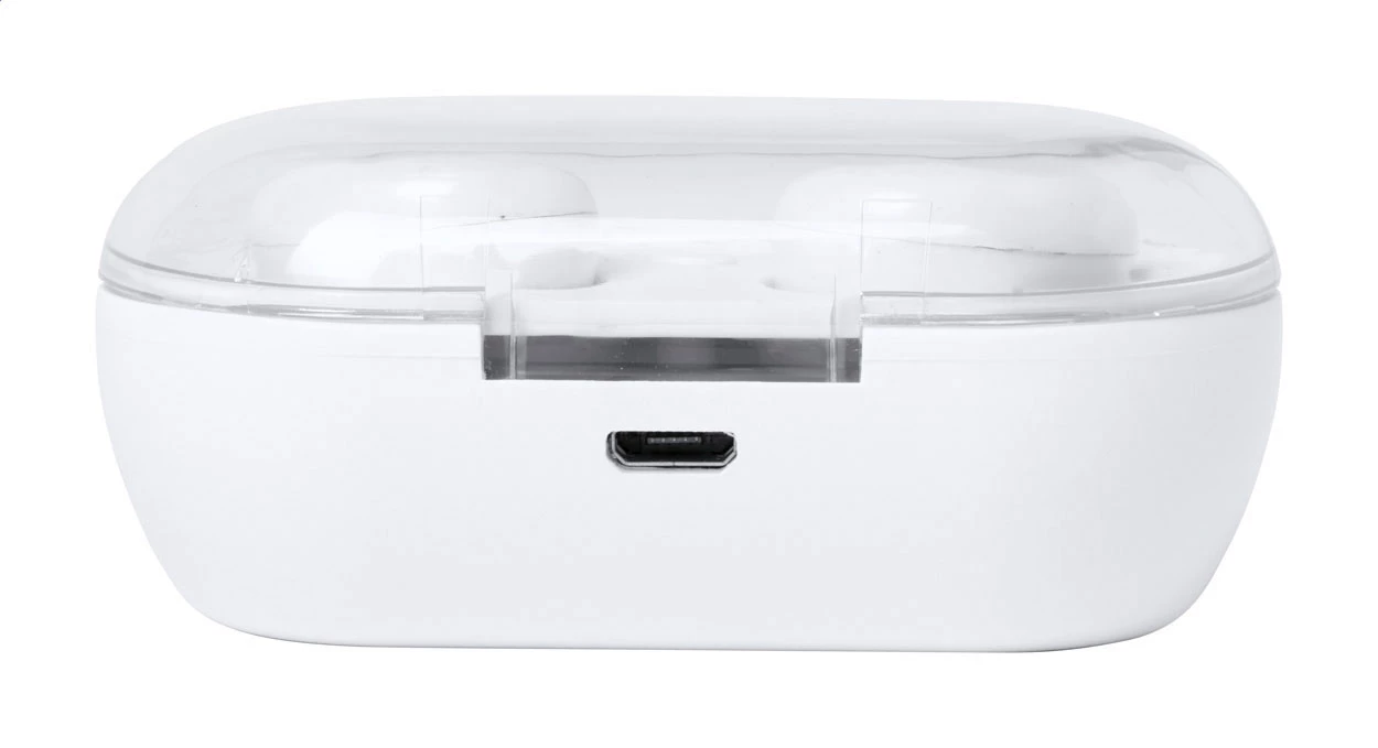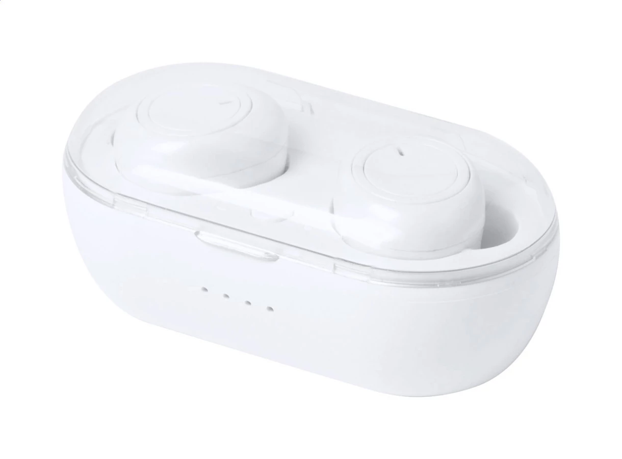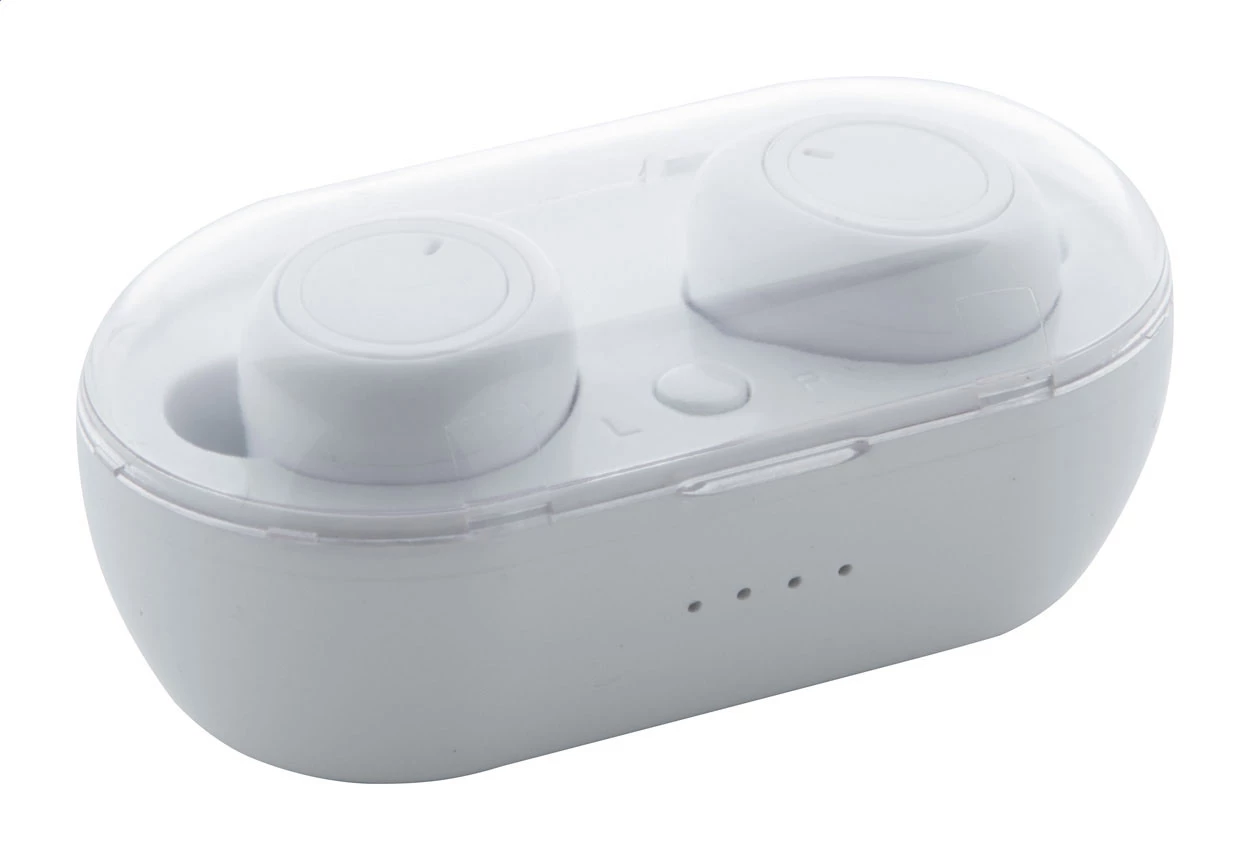 Prawdziwie bezprzewodowe słuchawki stereo (TWS) z funkcją zestawu głośnomówiącego w plastikowym etui z ładowarką. W zestawie kabel USB do ładowania.