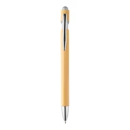 Bambusowy długopis z końcówką do ekranu dotykowego, błyszczącymi metalicznymi detalami i rysikiem w pasującym kolorze. Z niebieskim wkładem.