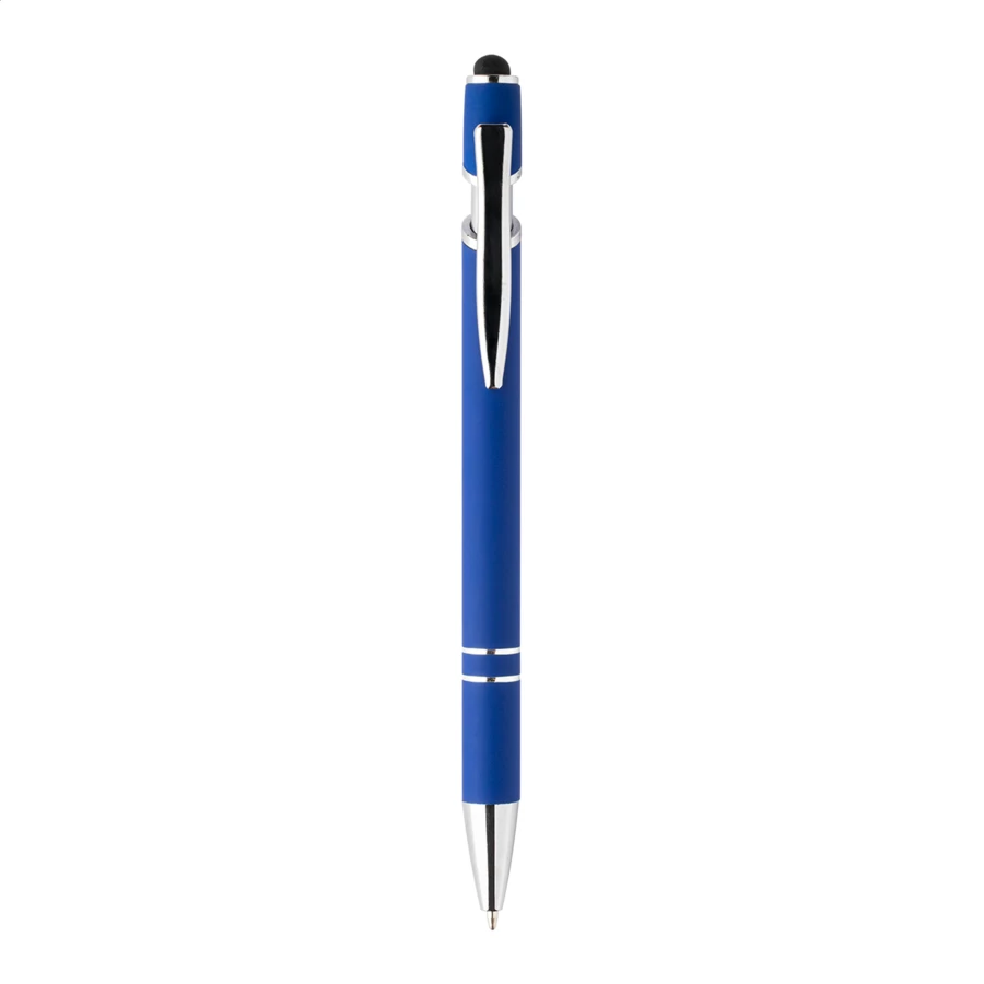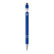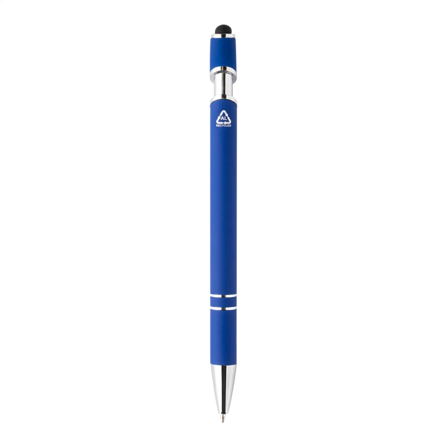 Długopis z recyklingowanego aluminium z końcówką do ekranu dotykowego, gumowaną obudową i chromowanymi detalami. Z niebieskim wkładem.
