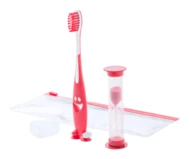 Zestaw do zebów dla dzieci z plastikową szczoteczką, timerem piasku oraz zamykanym na zamek plastikowym opakowaniu.