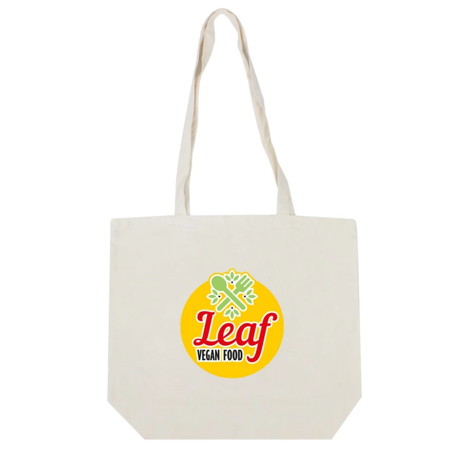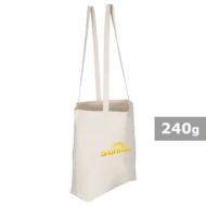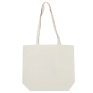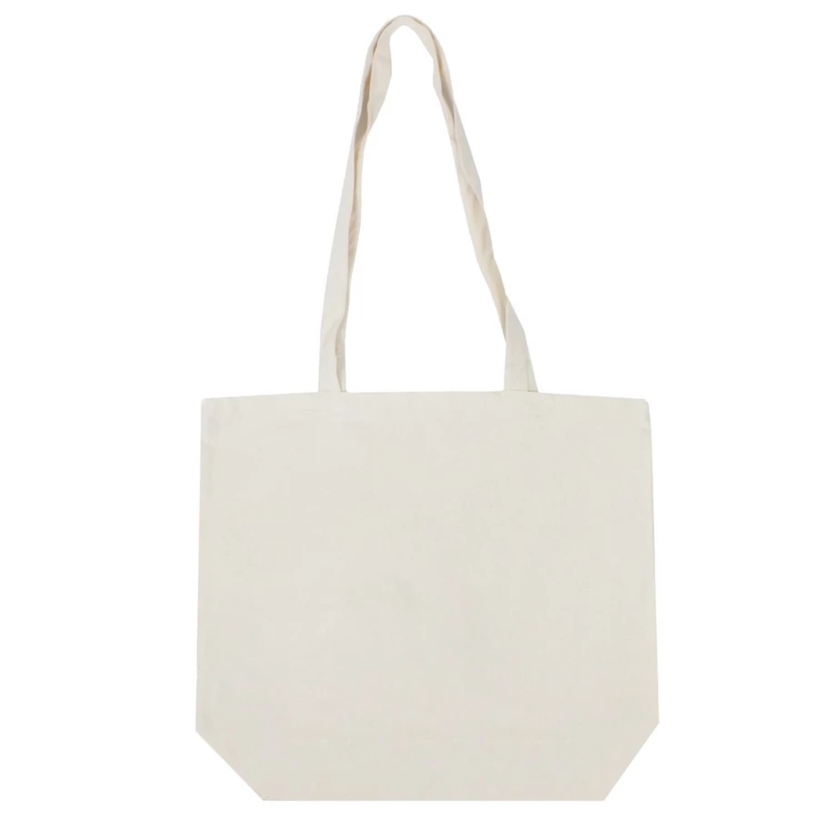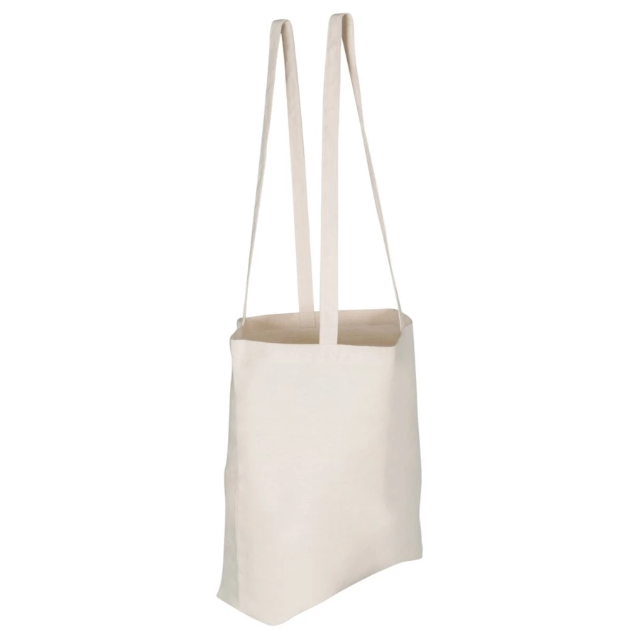 Torba na zakupy, posiada długie uchwyty (długość 70 cm, szerokość 2,5 cm) umożliwiające noszenie na ramieniu, produkt wykonany z bawełny o gramaturze 240 g/m2