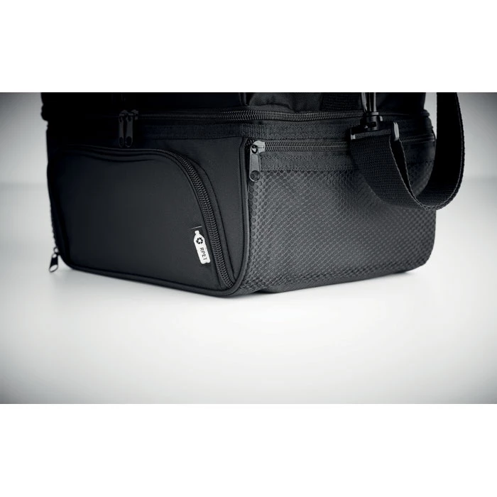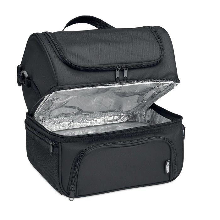 Izolowana torba chłodząca z 600D RPET zawiera pojemnik wielokrotnego użytku z PP o pojemności 1900ml. Posiada 2 sekcje do oddzielnego przechowywania ciepłej i zimnej żywności. Regulowany i odpinany pasek na ramię. Podszewka z 2 mm folii aluminiowej.