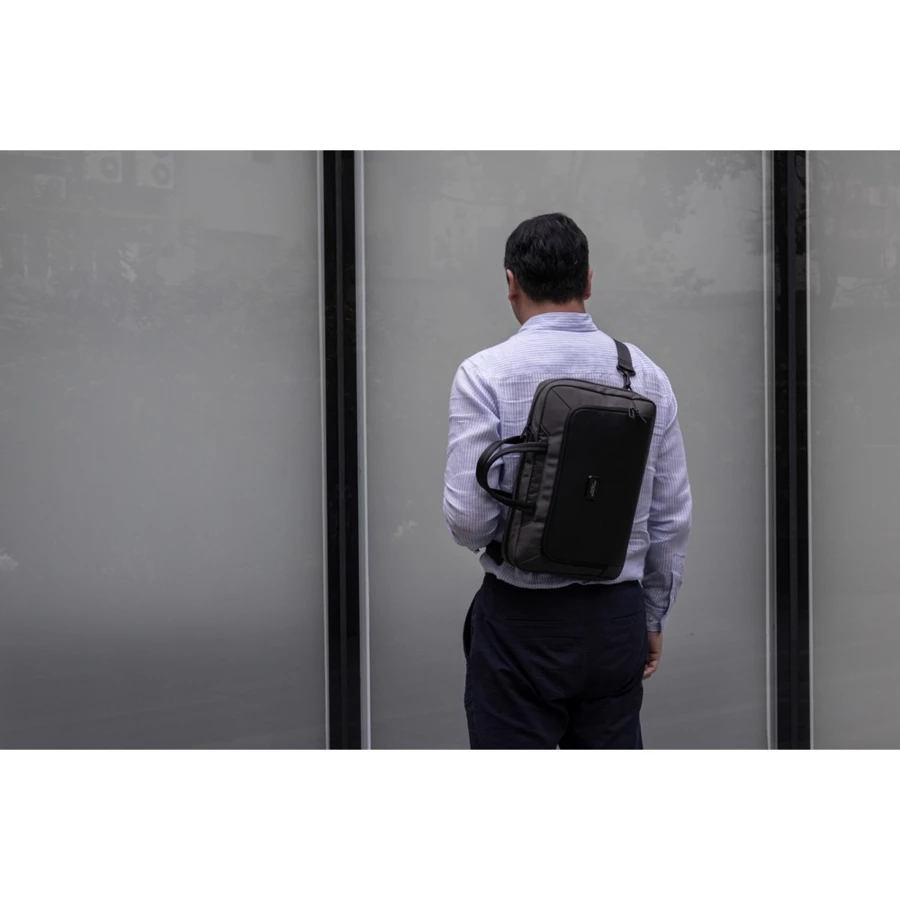 Torba na laptopa 16" BrandCharger Zenith, potrójny system noszenia (w ręku, na ramieniu lub jako plecak cross body), wyściełana przegroda na laptopa 16”, przednia kieszeń na długopisy i drobne urządzenia, główna komora z zapinaną na zamek kieszenią z siatki, produkt wykonany z poliestru z recyklingu