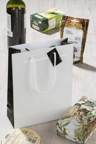 Uniwersalna torba papierowa do pakowania prezentów będzie pięknym opakowaniem nie tylko świątecznych upominków. Posiada eleganckie czarne boki, które są jej dodatkową ozdobą. Torba z rączkami ze sznurka, do rączek dołączony bilecik, na którym można wydrukować logo lub wpisać własny tekst życzeń. Gramatura papieru 157 gsm.