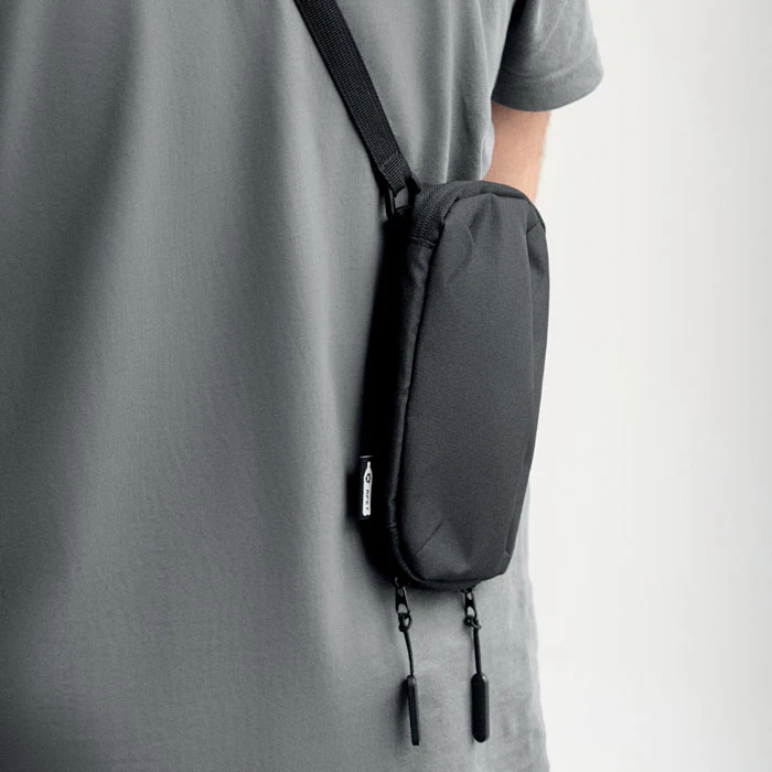 Uniwersalna torba na smartfona z poliestru 300D RPET z regulowanym paskiem. Przednia i boczna kieszeń na zamek błyskawiczny. Główna komora posiada kilka kieszeni.