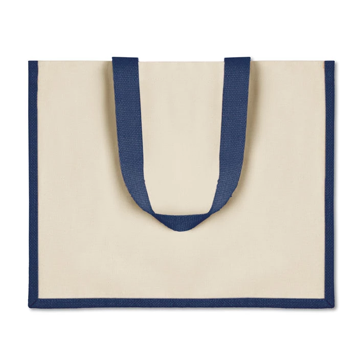 Jutowa torba na zakupy, wewnątrz laminowana, z zewnątrz płócienna. Posiada długie, bawełniane uchwyty.