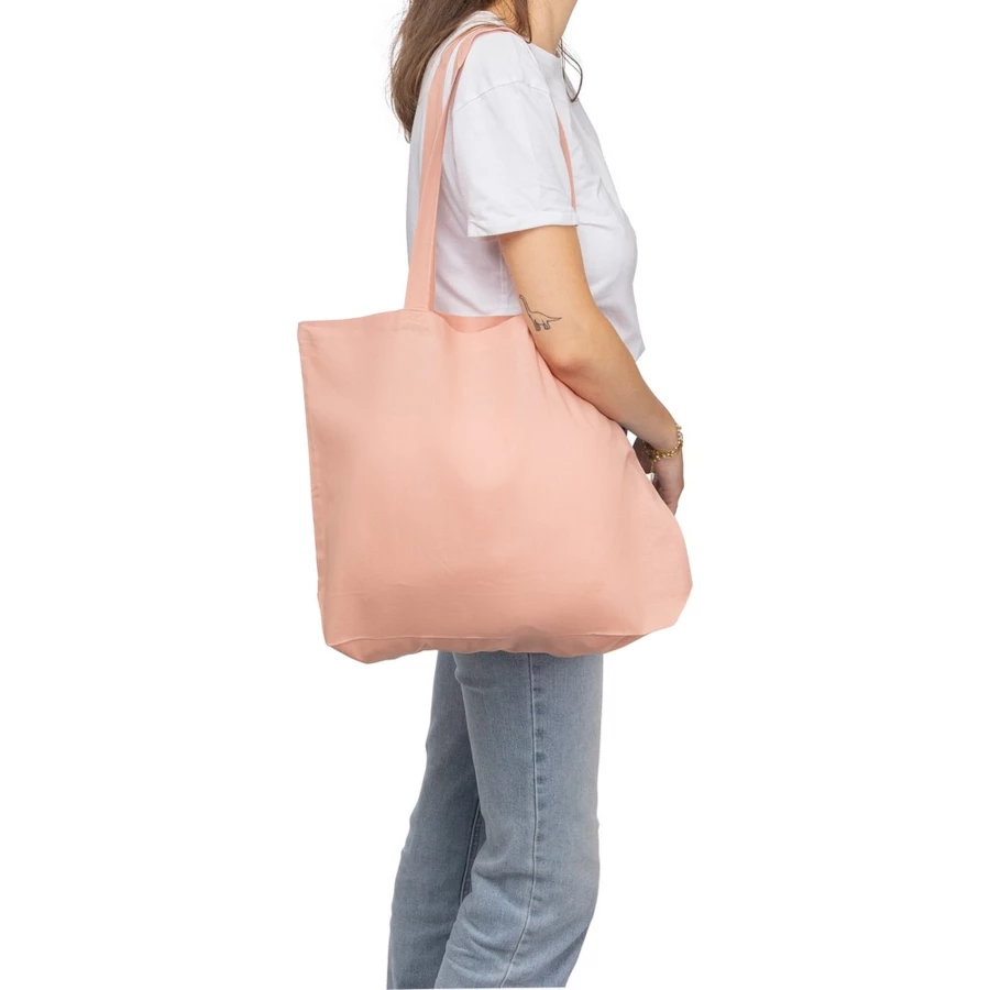 Torba na zakupy 140 g/m², o pojemności 16 litrów, posiada długie uchwyty umożliwiające noszenie na ramieniu (2,5 x 70 cm), ikona OEKO-TEX na metce, produkt wykonany z farbowanej bawełny
