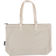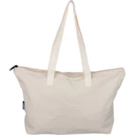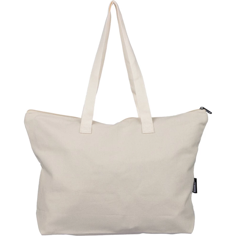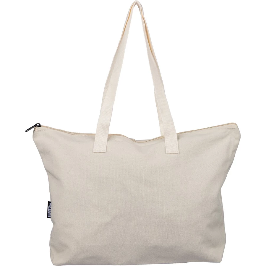 Torba na zakupy 330 g/m², duża kieszeń zapinana na zamek, posiada długie uchwyty umożliwiające noszenie na ramieniu (65 x 2,5cm), ikona RPET na metce, produkt wykonany z polibawełny z recyklingu, poliestru i RPET
