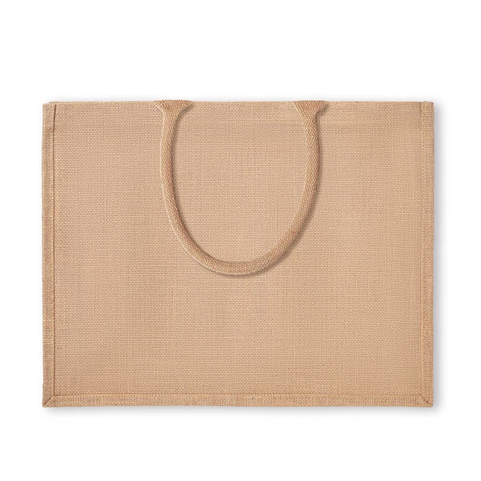 Jutowa laminowana torba na zakupy z krótkimi uchwytami, wykonanymi z bawełny. Ten produkt posiada certyfikat OEKO-TEX® STANDARD 100.