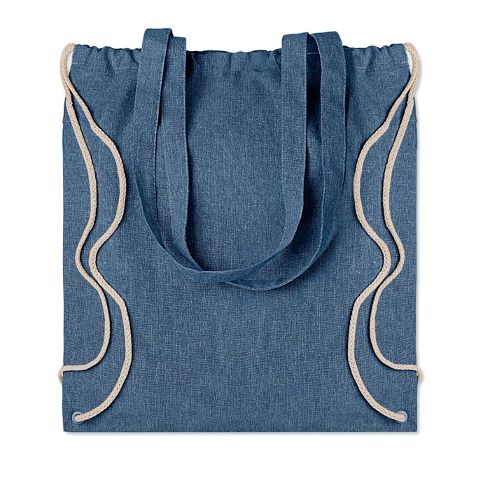 Dwukolorowa torba na zakupy z bawełny z recyklingu oraz z poliestru z recyklingu, ze sznurkiem i długimi uchwytami (20%/80%). Ok. 140 gr / m². Ten produkt może się kurczyć po zadrukowaniu.